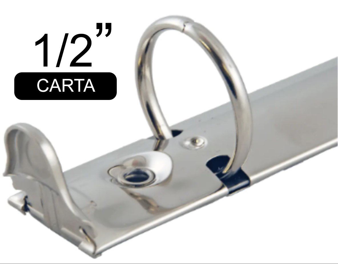 Herraje tamaño carta (280 mm.) de tres argollas circulares con diámetro de 1/2 pulgada con palancas, base de 20 mm. (normal) y acabado níquel (plateado), capacidad 110 hojas.